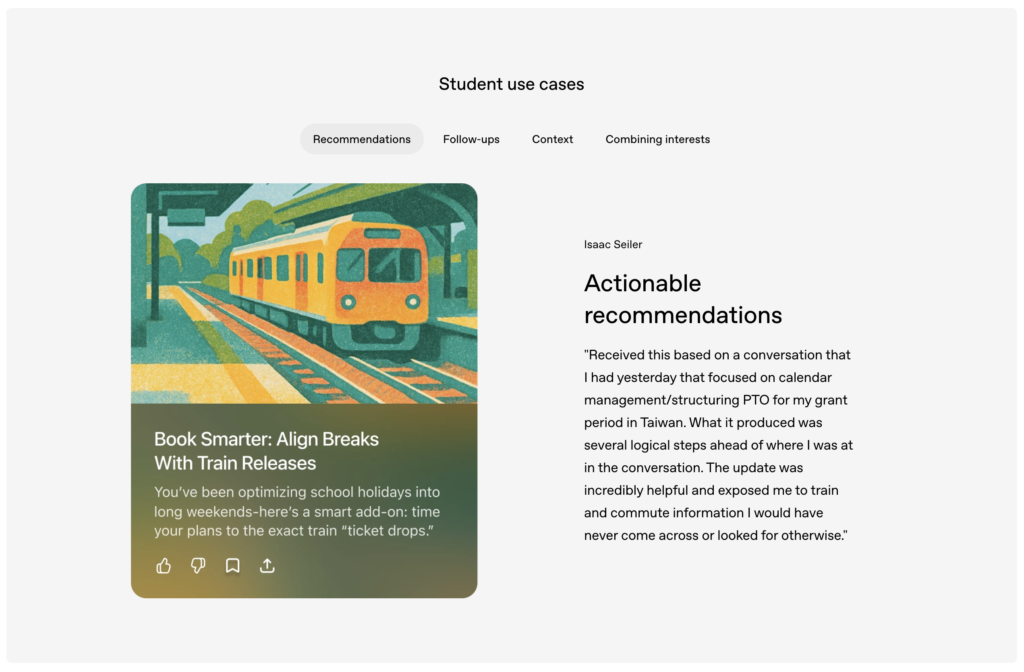 OpenAI 在 ChatGPT Lab 與大學生合作收集回饋。許多學生表示,當他們清楚告訴 Pulse 想看到什麼主題時,Pulse 推出的資訊能「往前一步」,展示出原本沒想到但有價值的訊息。