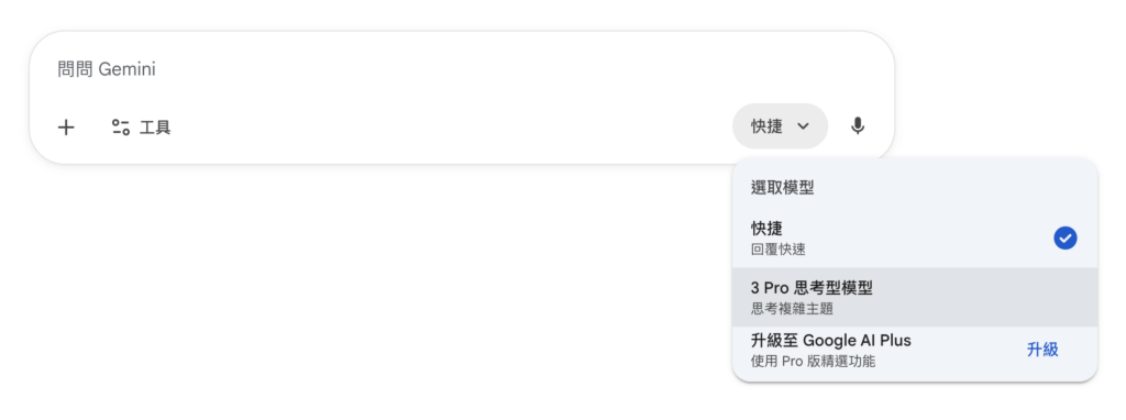 Gemini:直接開啟 網頁版 Gemini ,右下角的「模型選擇(Model)」預設是「快速(2.5 Flash)」,點開後切換成Thinking(3 Pro)。