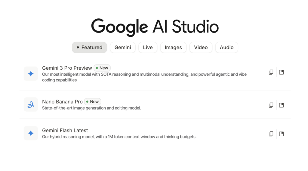 Google AI Studio:開啟 Google AI Studio,選擇「Gemini 3 Pro Preview」。
