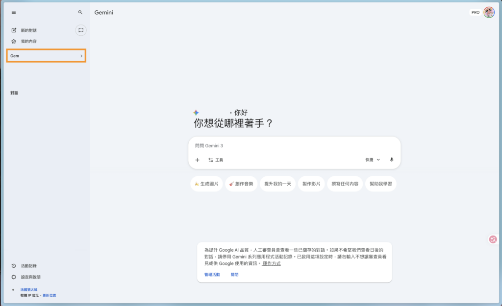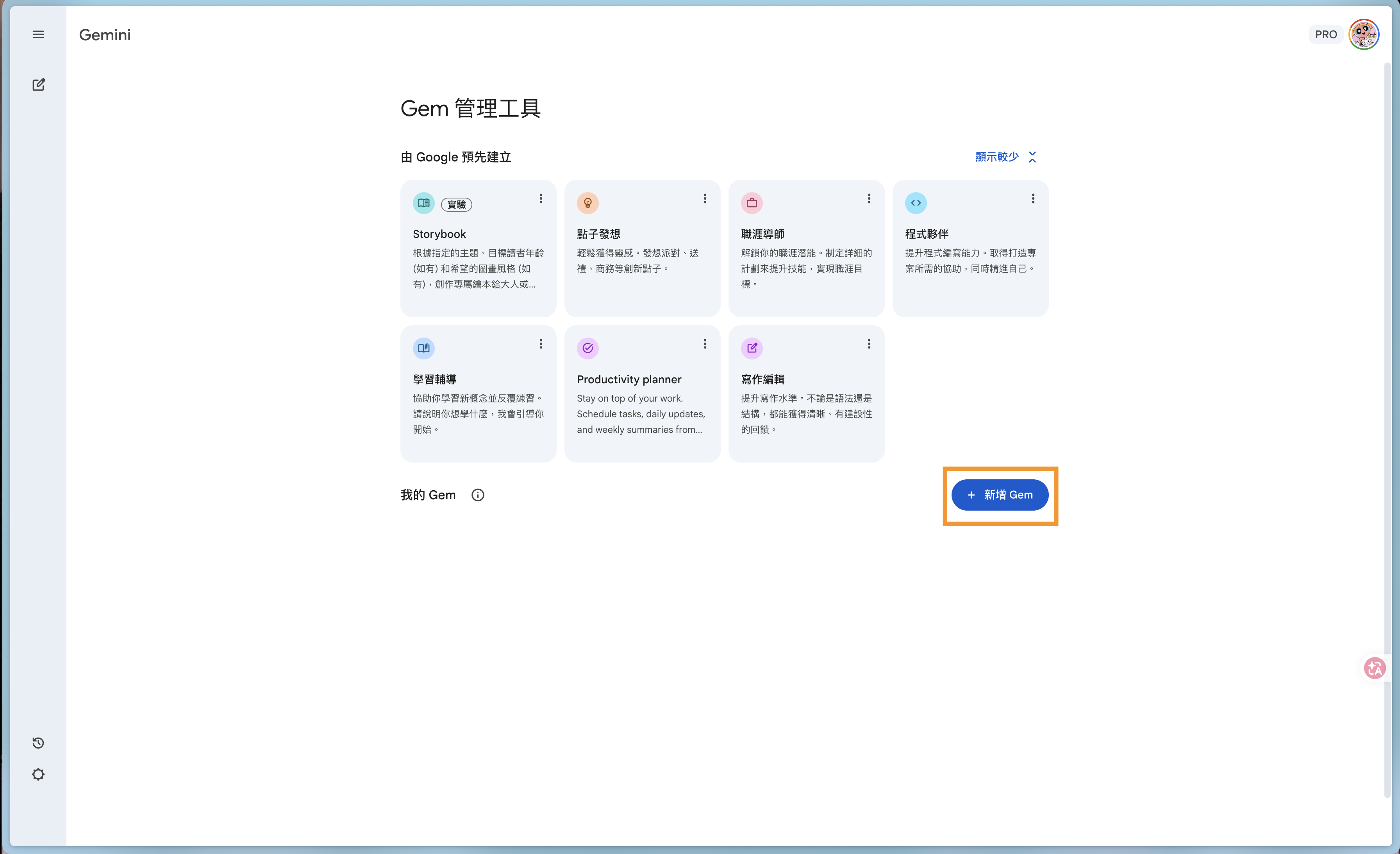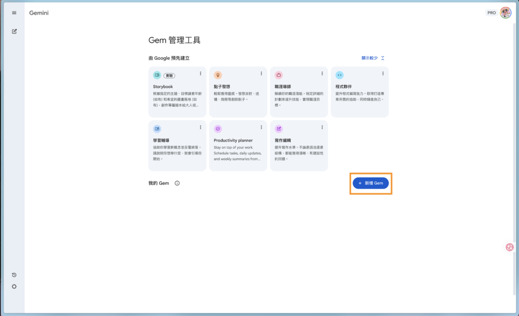 在 Gemini 的網頁介面左側選單中,你會看到「Gem 管理程式」或一個「+」號(新建 Gem)。點擊進去,就會看到現有的預設 Gems(如:學習夥伴、創意構思家)以及建立新 Gem 的選項。