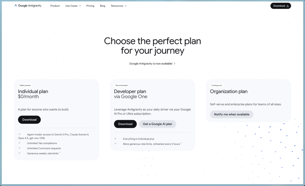 根據 Google 的官方訊息,所有用戶都可免費試用 Antigravity 並享有 Gemini 3 Pro 支援、無限 Tab 補全以及代理管理和瀏覽器整合。然而,因應大量需求,Google 調整了速率限制:Google AI Pro 與 Ultra 訂閱者享有更高的優先權和刷新更快的額度。免費層則改採每週計算的較大額度,以避免在單一專案中過快耗盡配額。不論等級,使用者的配額取決於代理所完成的「工作量」;簡單任務消耗較少,複雜推理耗費較多。