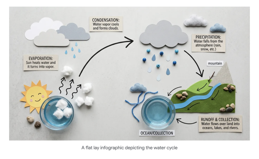 指令:高品質的平鋪攝影作品,以簡潔明了的方式呈現水循環原理,背景為乾淨的淺灰色紋理。視覺敘事由左至右清晰展開。簡潔的黑色箭頭手繪在背景上,引導觀者的視線。整體風格兼具教育性、現代感和易懂性。照片以俯視視角拍攝,柔和均勻的光線最大限度地減少了陰影,使畫面重點突出水循環過程。解析度與比例:從 512 到 4K 的自由度